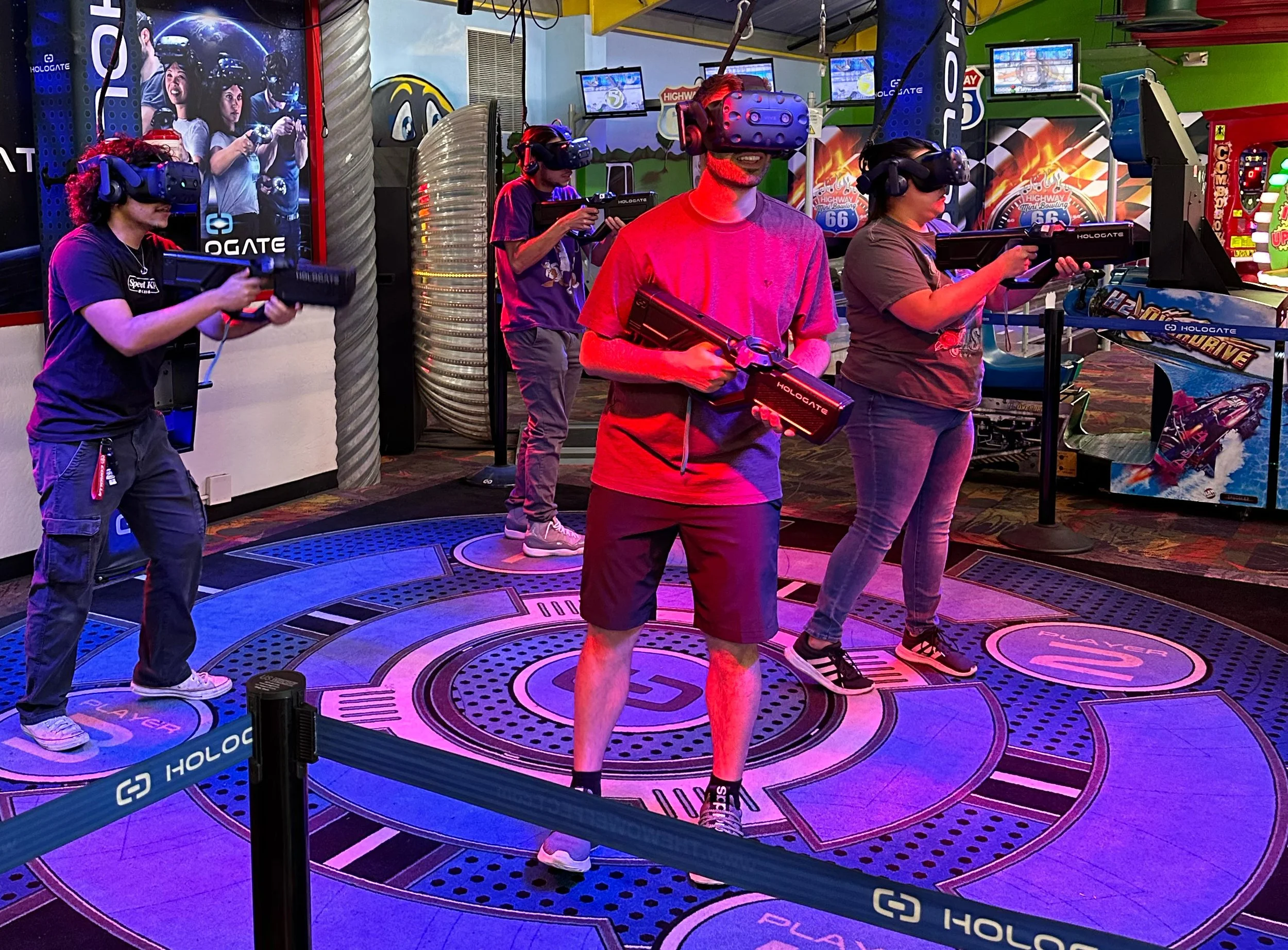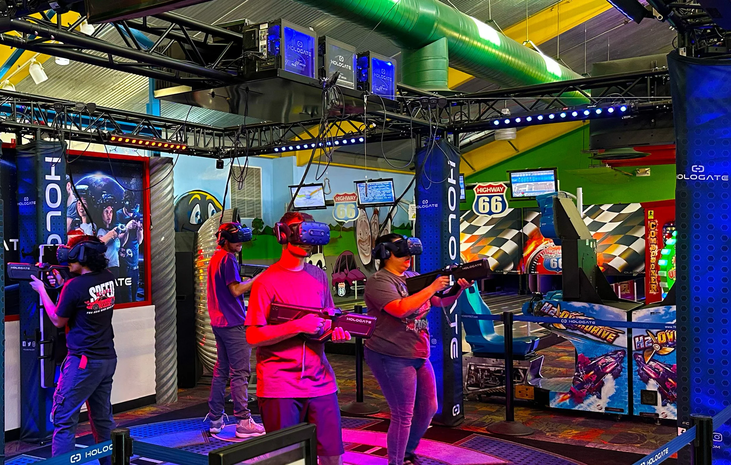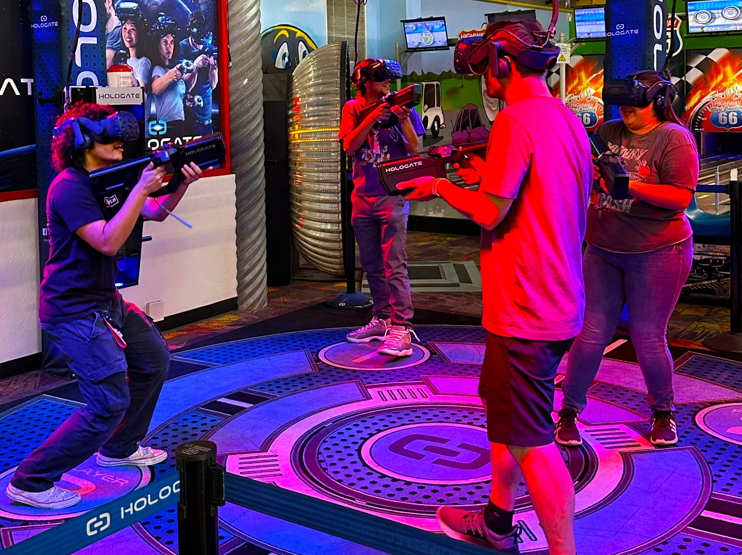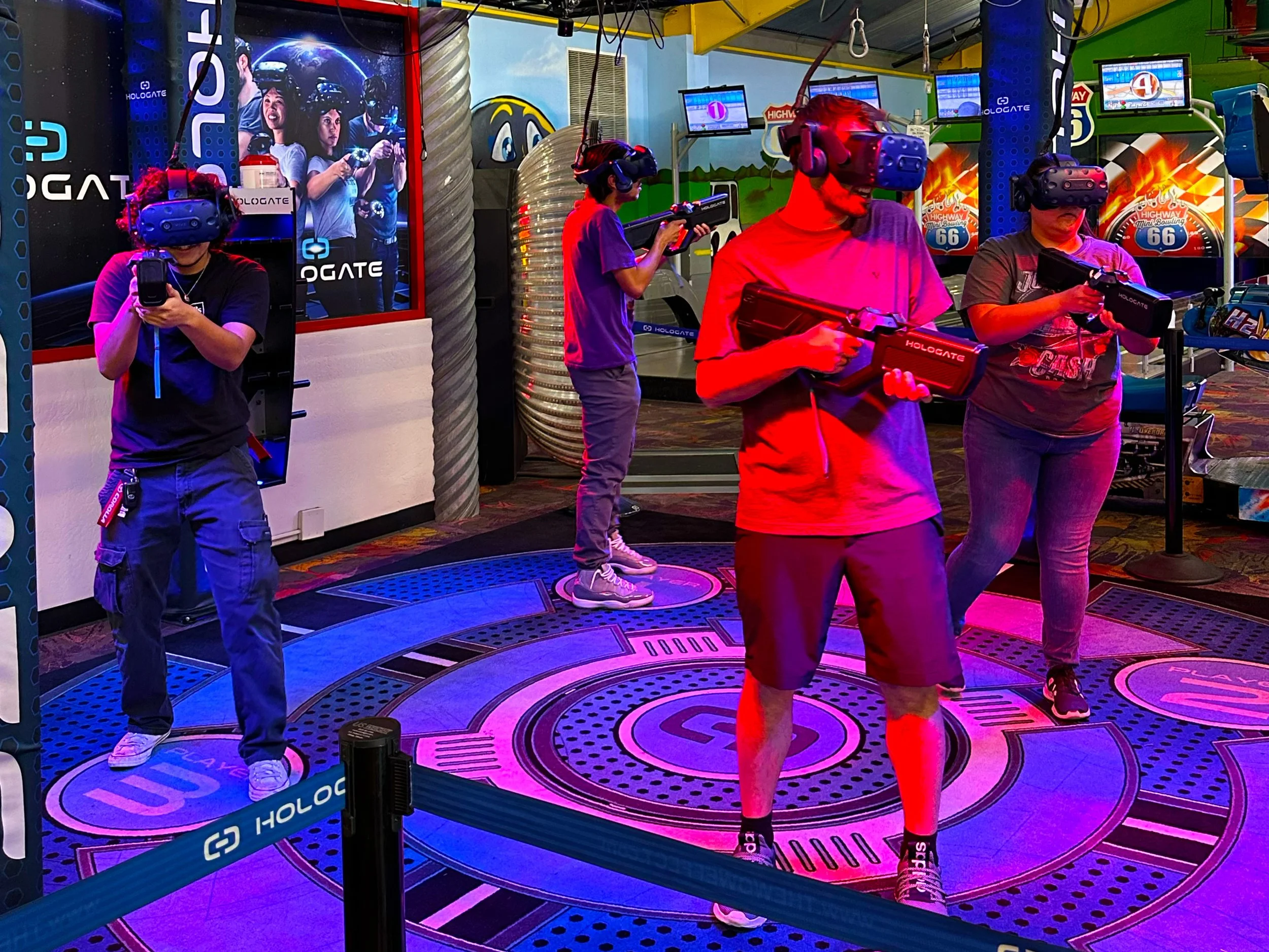 In this 4-player game, put on your 3D headsets, grab your blasters and fight off zombie hordes, shoot snowballs at dangerous yetis, and survive as high tech neon lit ninjas attack you! Teamwork is key to beat these challenges, are you up to the task?!
